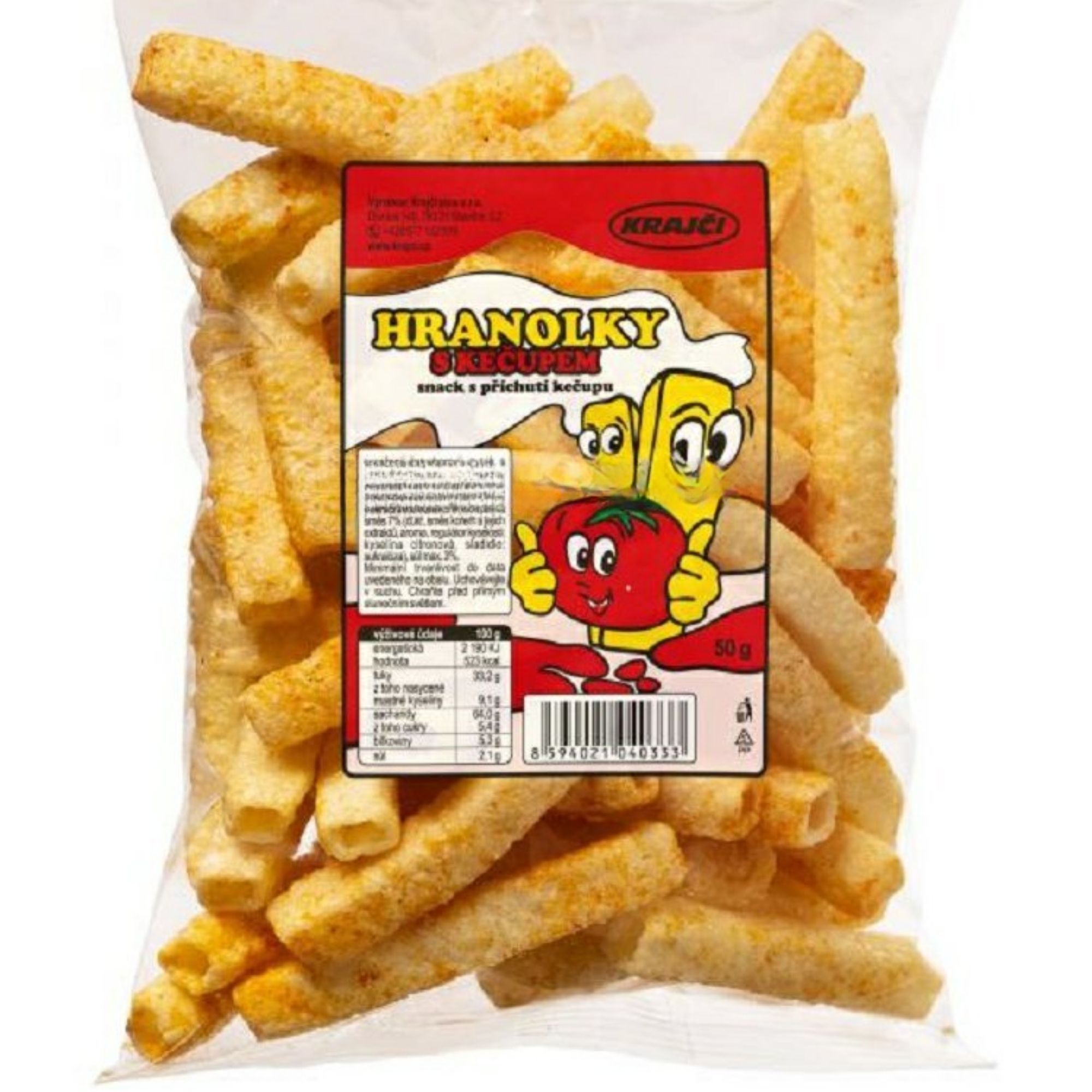 sušené bramborové vločky, řepkový olej, bramborový škrob, pšeničná mouka, koření kečupová směs 7% (cukr, směs koření a jejich extraktů, aroma, regulátor kyselosti: kyselina citronová, sladidlo: sukralóza), sůl max. 3%.